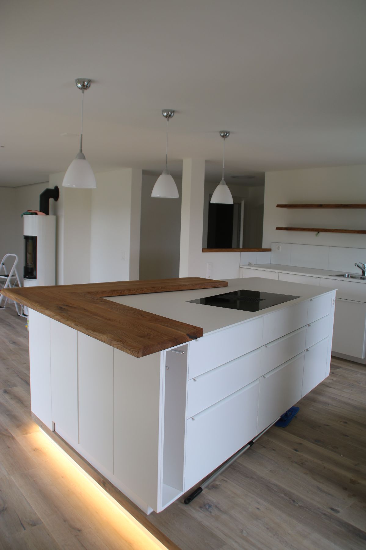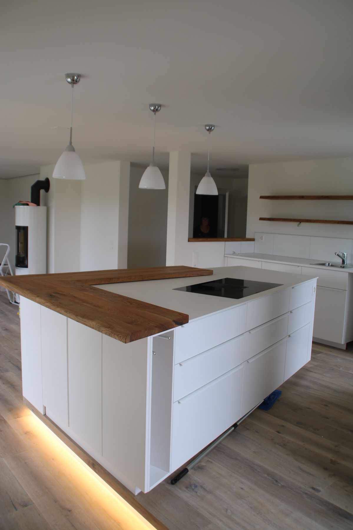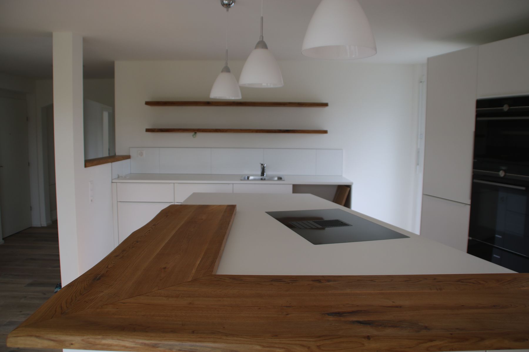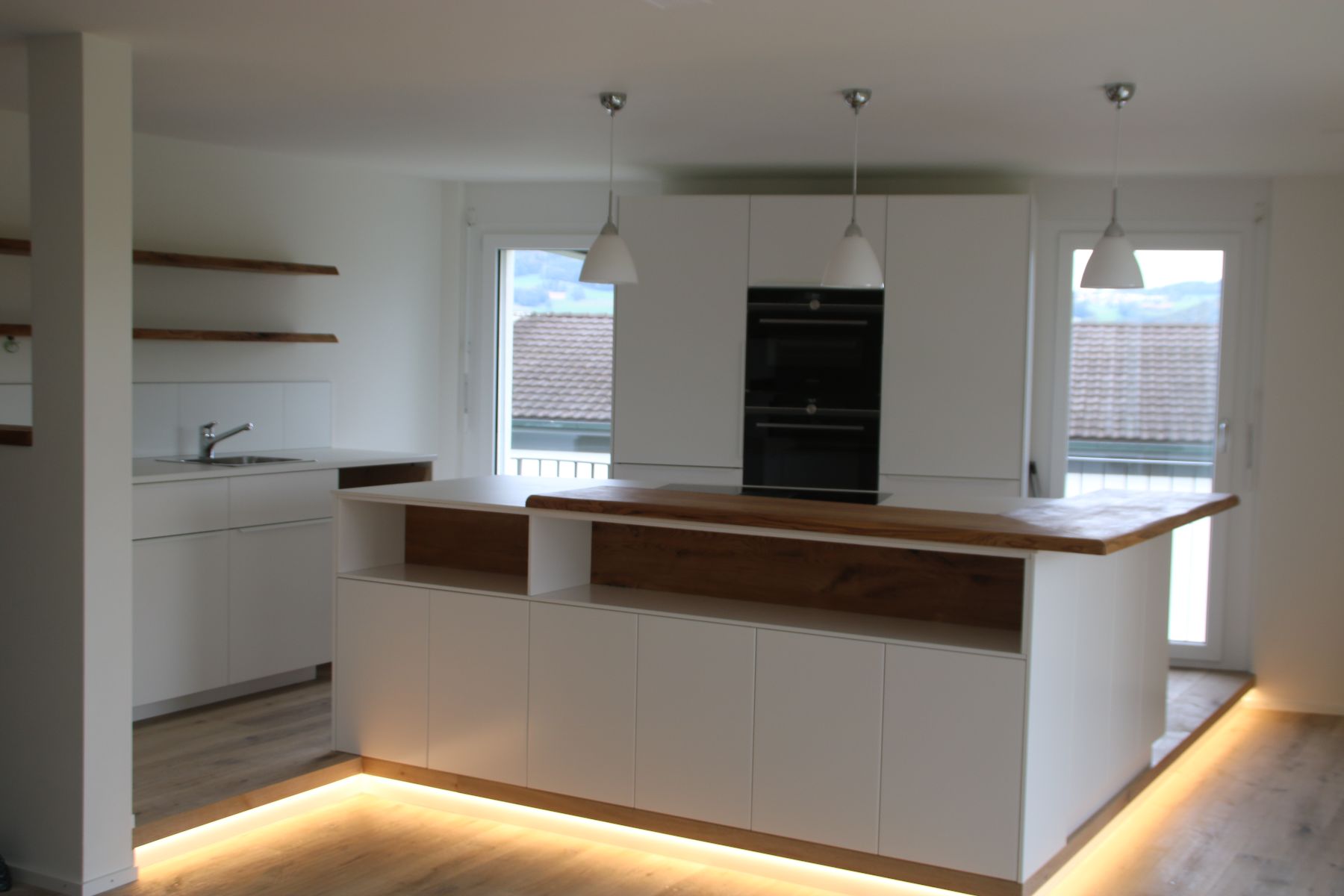 alle böden werden neu mit parkett in eiche, weiss vintage-struktur verlegt. neu wird die küche mit einer kochinsel ausgestattet. unter der küche wird ein podest eingebaut, sodass alle installationen in diesem bereich verlegt werden können. auch der dampfabzug wird in dieser installationsebene an die fassade geführt. aufgrund der baulichen massnahmen ist es naheliegend die anschliessende dusche auch komplett zu sanieren. dort wir nun neu eine bodenrinne als dusche eingebaut. auch eine mini-waschmaschine gehört in zukunft zur ausstattung dieser wohnung.